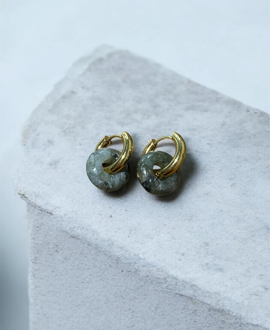 Un par de aros con presencia elegante y un toque de misterio. La Labradorita aporta un brillo sutil que cambia con la luz, generando un efecto visual que sorprende sin estridencias. Perfectos para quienes buscan una joya con estilo único y vibración introspectiva.
